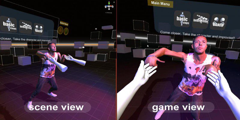 animations were applied to the character using a complex Inverse Kinematics (IK) system applied to the rigged 3D Human Model. Characters are rigged with custom skeletons using 3D geometrical bones and IK solvers. Motion Capture data were retargetted so that animations of the 3D character are produced. The Motion Capture data, derived from the tracking device Kinect v2, were applied to the rigged 3D model to create realistic dance animations. Rendering optimization techniques such as Baked GI, were applied in the scene to reduce the GPU rendering load and to increase the frame rate per second (FPS) of the VR Application.